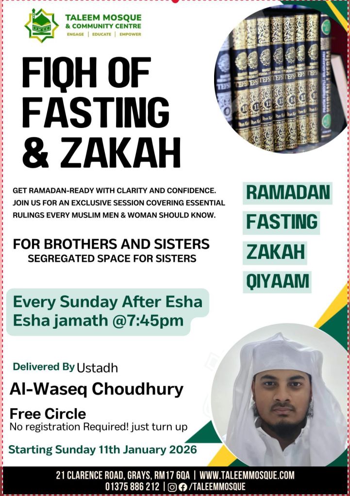 Taleem Masjid will be starting a *new course* in preparation to Ramadan. We will be running *weekly free classes* covering the Fiqh of Fasting & Zakah.