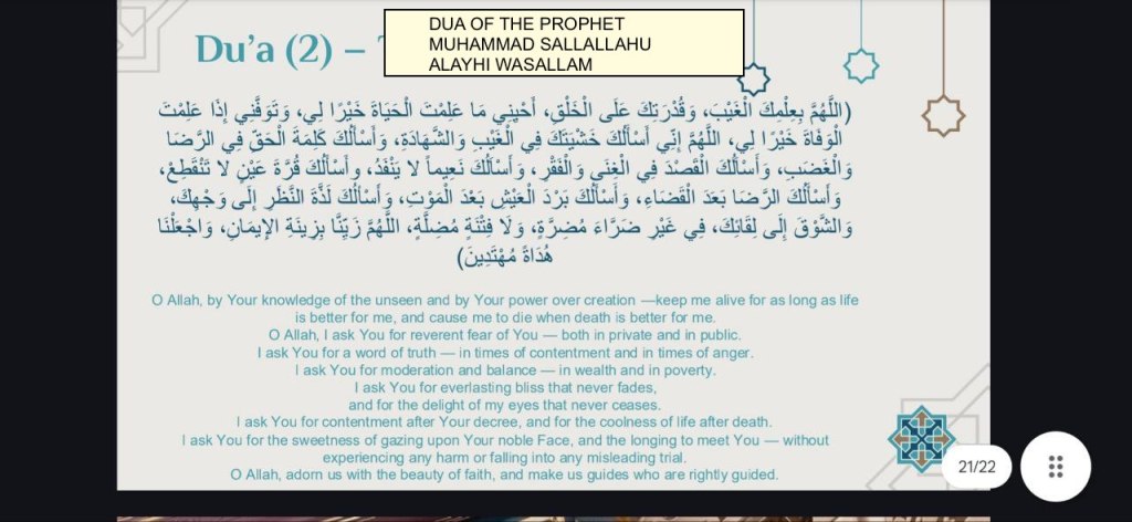 This dua is literally an appeal to Allah… asking Our Lord, Our Loving Creator, to grant us a life of goodness, death when it’s right, fear and awareness of Him, contentment, truthfulness, great bounties, and of the greatest bounties is to be honoured to see His Face in the afterlife. We plead Allah to allow us to meet Him, and look forward to the meeting, and to be protected from harm, to be adorned with true faith, and be guided aright.